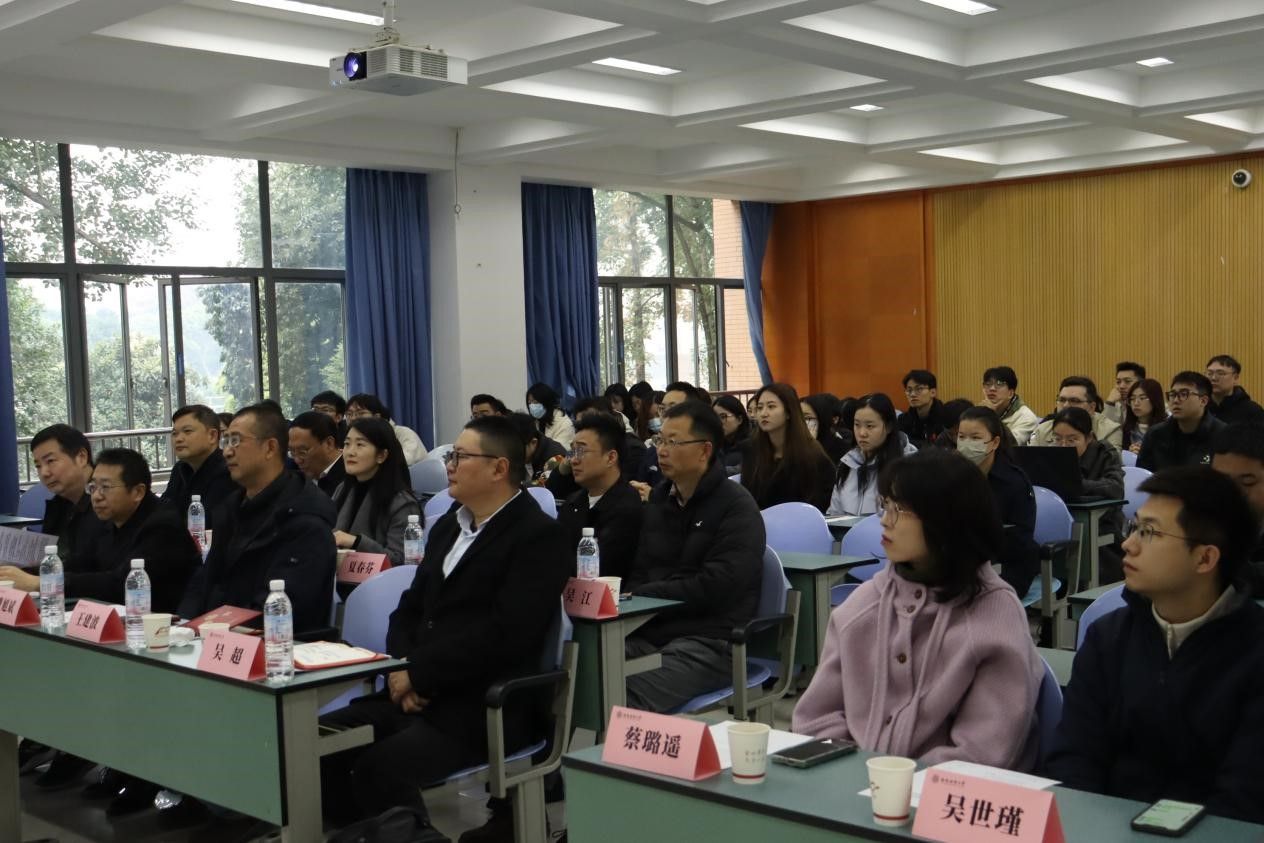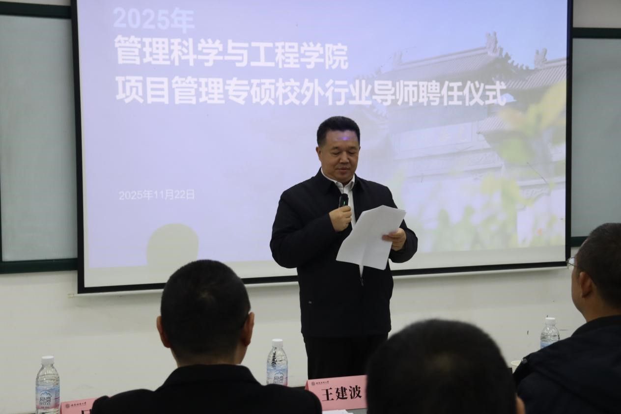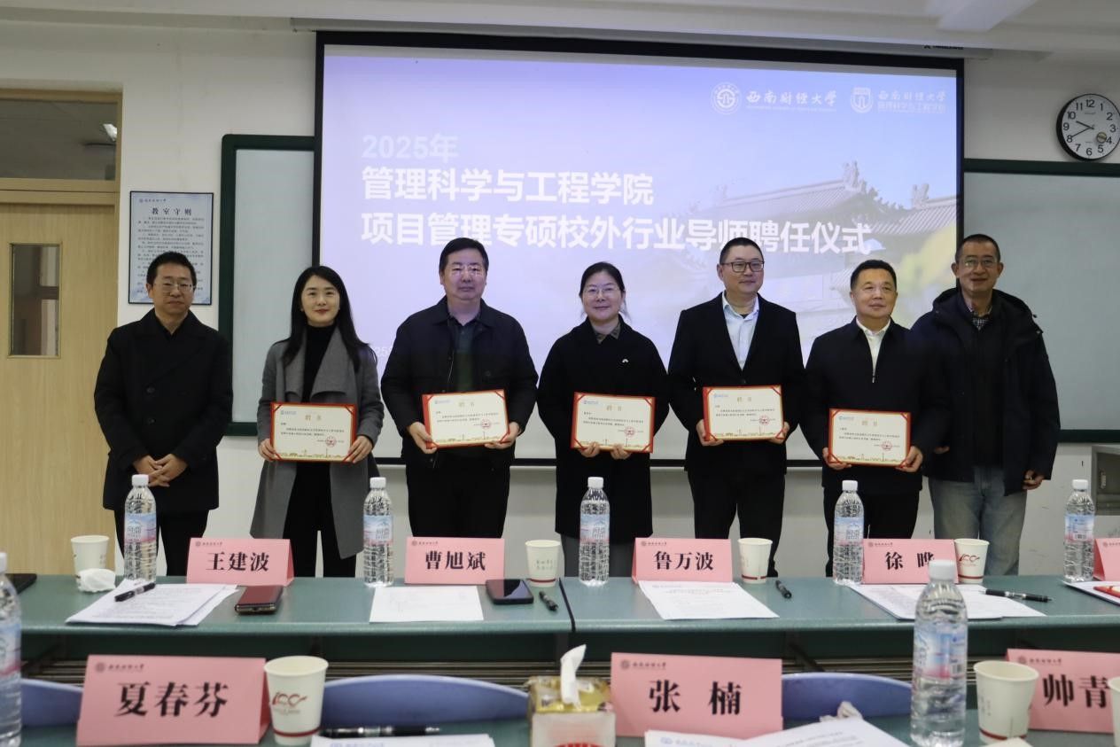 2025年11月22 日,西南财经大学管理科学与工程学院在光华校区成功举办项目管理专硕校外行业导师聘任仪式。成都超算中心运营管理有限公司董事长王建波、四川省电子商务协会常务副会长徐晔、成都映潮科技股份有限公司董事长吴超、四川映乡者文化传媒有限公司首席执行官刘渊、成都种智孵化器管理有限公司总经理夏春芬、中铁信托有限责任公司高级经理张楠等行业优秀代表受邀出席。学院党委书记曹旭斌,院长鲁万波,党委副书记、纪委书记袁程炜,教师代表及2025级项目管理专硕全体学生共同参加。