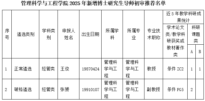根据《西南财经大学研究生导师岗位管理办法(试行)》(西财大办〔2023〕19号)要求,经教师本人申请,学院工作人员初审,党政联席会议审查,管理科学与工程学院学位评定分委会审核,现将本单位初审推荐的2025年新增博士研究生导师名单公示如下(见附件),公示期为2025年10月28日至2025年11月3日。如对公示结果有异议,可在公示期内反馈,联系人:陈老师,联系邮箱:chenj@swufe.edu.cn。