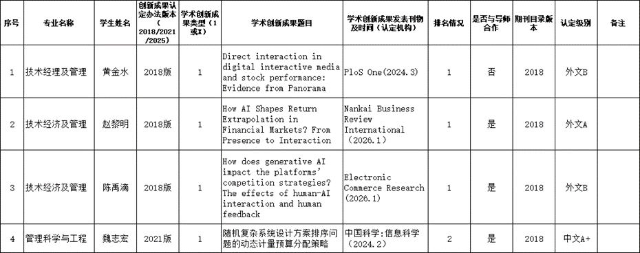 根据《西南财经大学博士生申请学位学术创新成果认定办法》和我院相应专业的博士生培养方案要求及科研成果发表的相关规定,学院对相关博士生的学术创新成果及科研情况进行了审核,现将结果予以公示。公示期15日,即自2026年4月14日至4月28日,在此期间若有异议,请及时反馈学院。